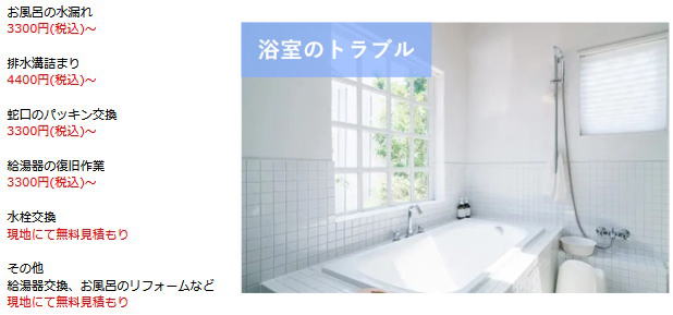 福岡県で対応可能なお風呂(浴室)の修理サービスとなります。その他のトラブルはお気軽に受付スタッフまでご相談ください。